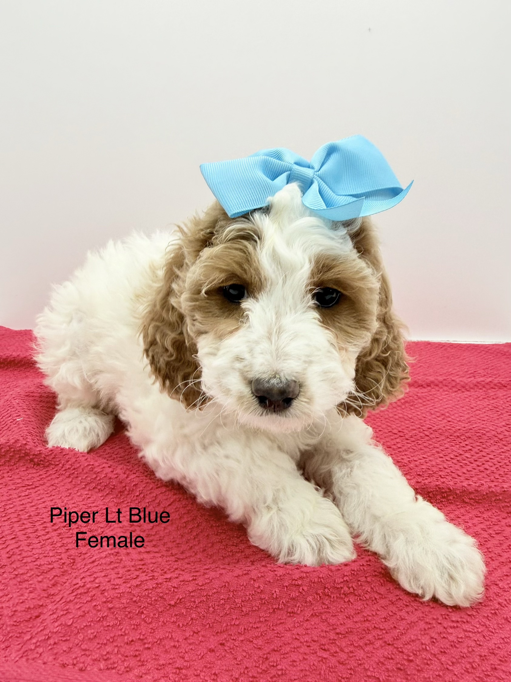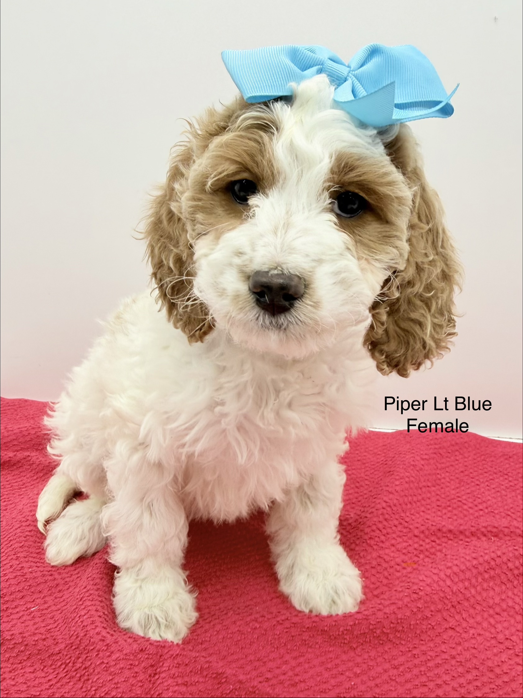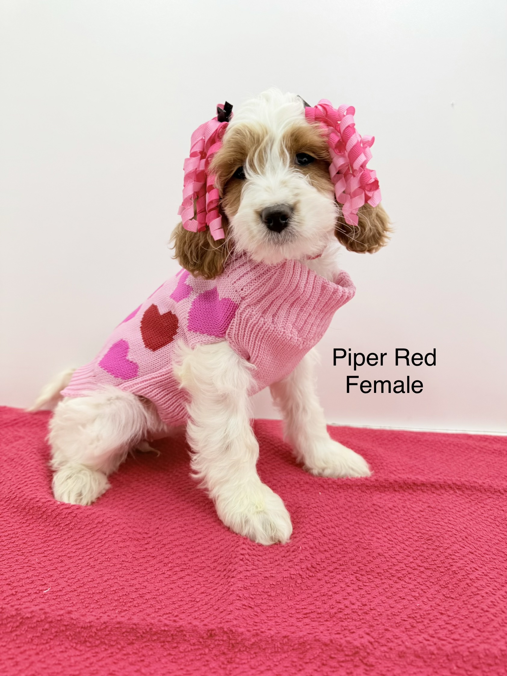 Piper is a F1 Black and White Parti Cockapoo, Dutton is a Red and White Parti Moyen Poodle.
