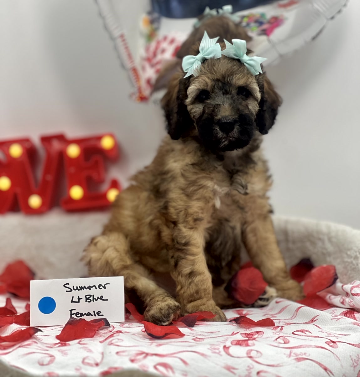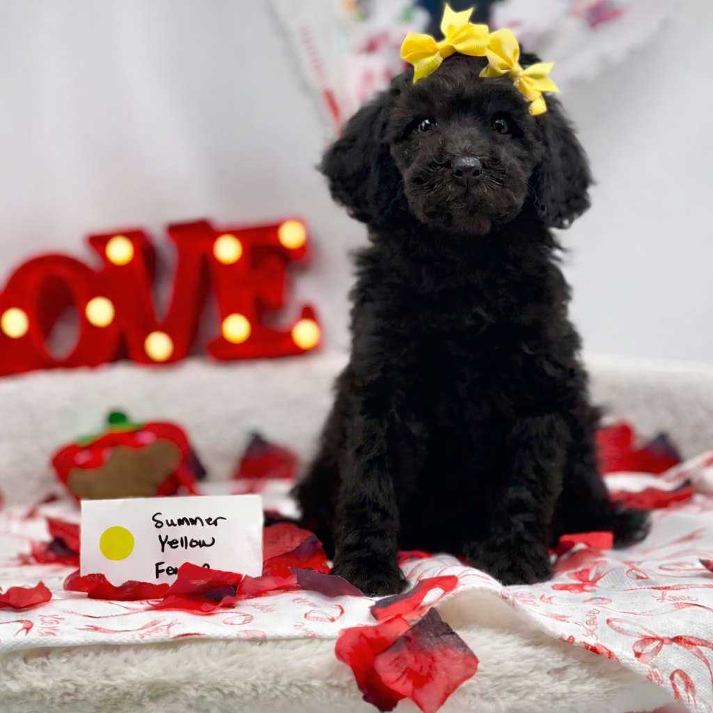 Summer is a sweet and stunning Labradoodle with a soft, wavy coat and a heart full of love. She's intelligent, gentle, and has a calm, affectionate nature that makes her an ideal family companion. She is about 30 lbs