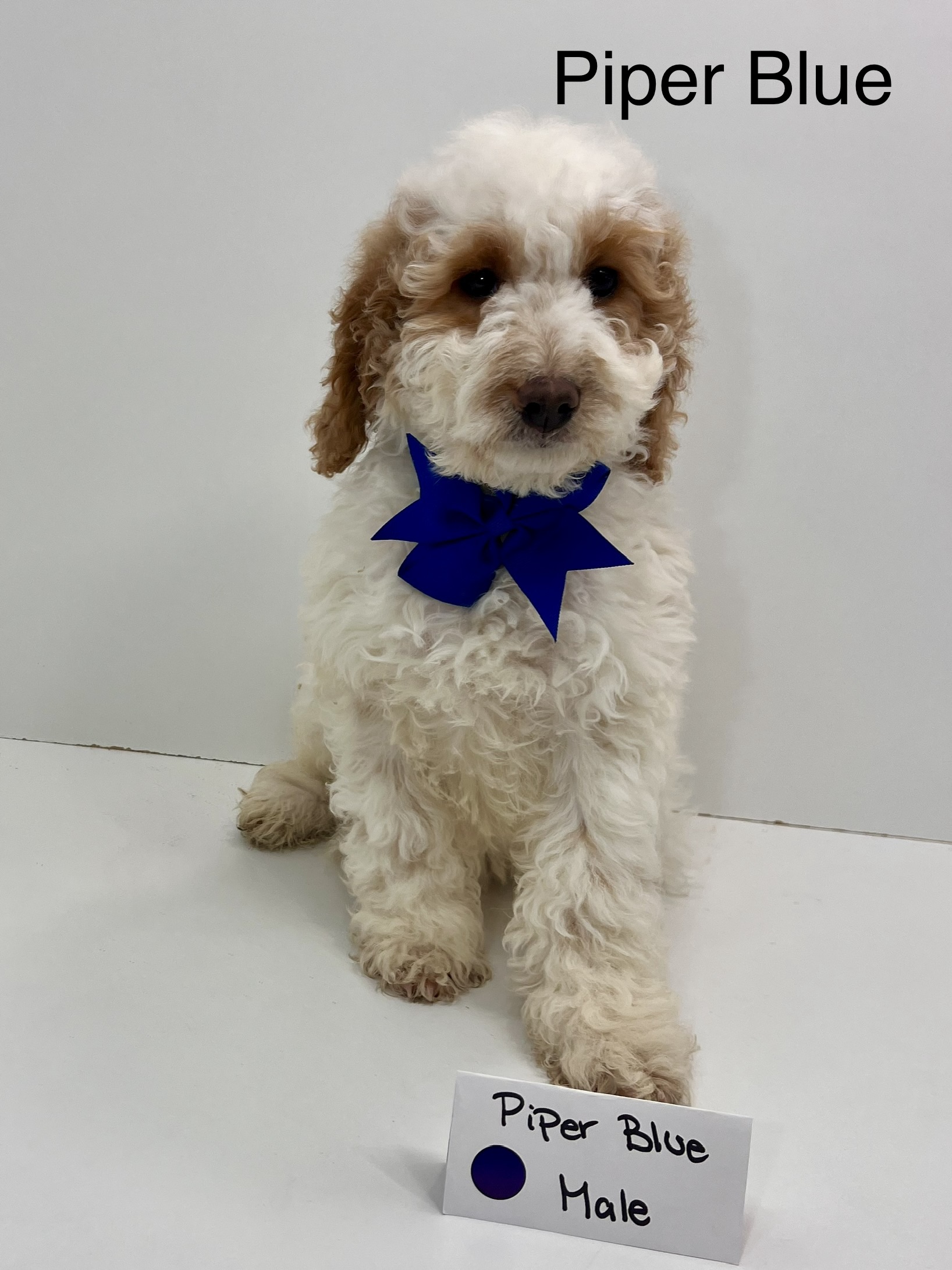 Piper is a F1 Black and White Parti Cockapoo, Dutton is a Red and White Parti Moyen Poodle.
