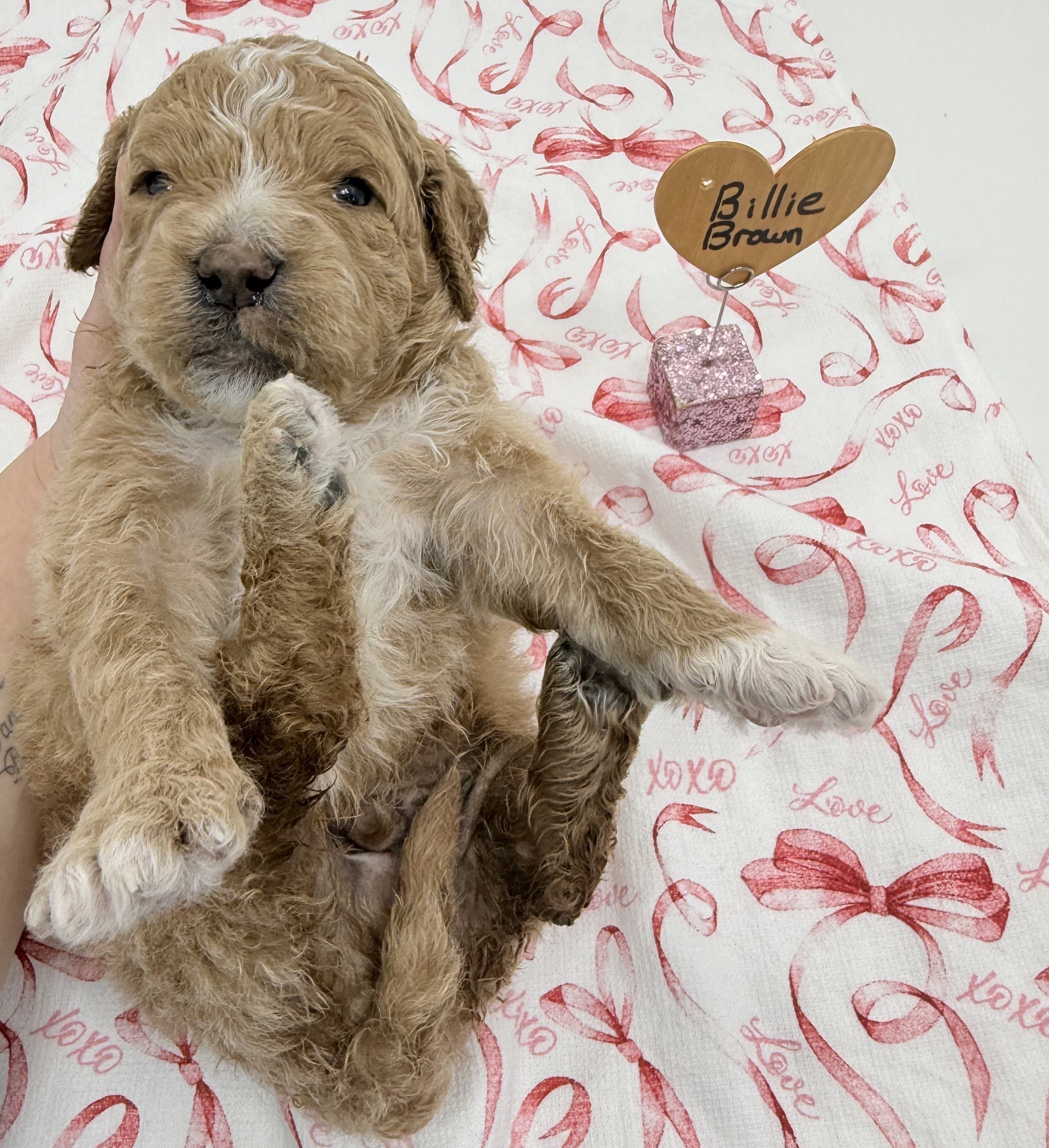 Billie is a Red Goldendoodle weighing 36 lbs of pure fluff. She loves belly rubs, treats, and pretending she’s a lap dog no matter the size.