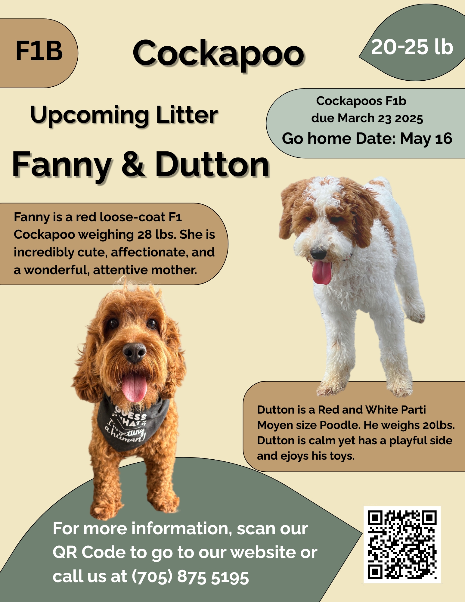 We are excited to announce an upcoming F1B Cockapoo litter from Fanny and Dutton, expected March 23, with puppies ready to go home May 16.
