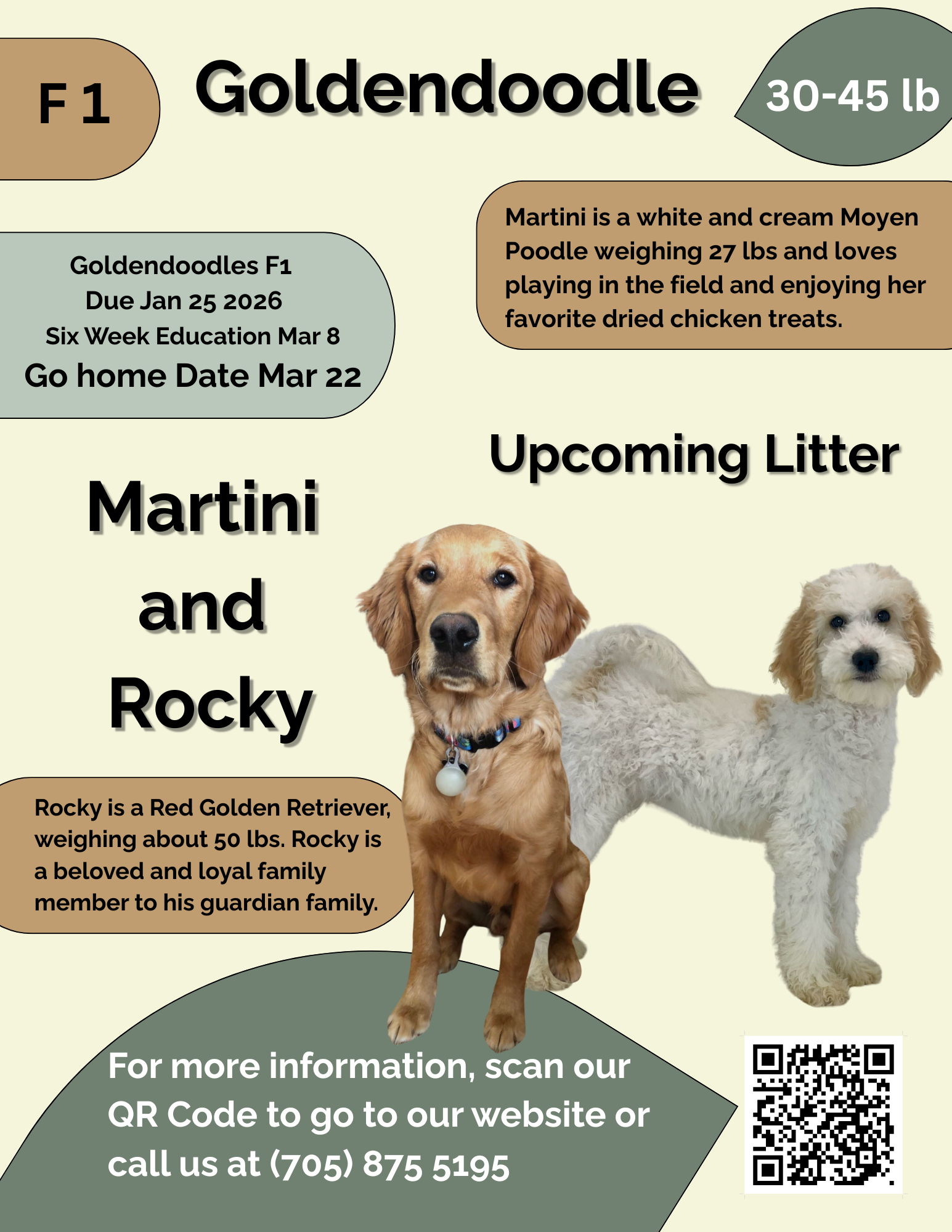 Martini is a white and cream Moyen Poodle weighing 27 lbs and loves playing in the field and enjoying her favorite dried chicken treats.