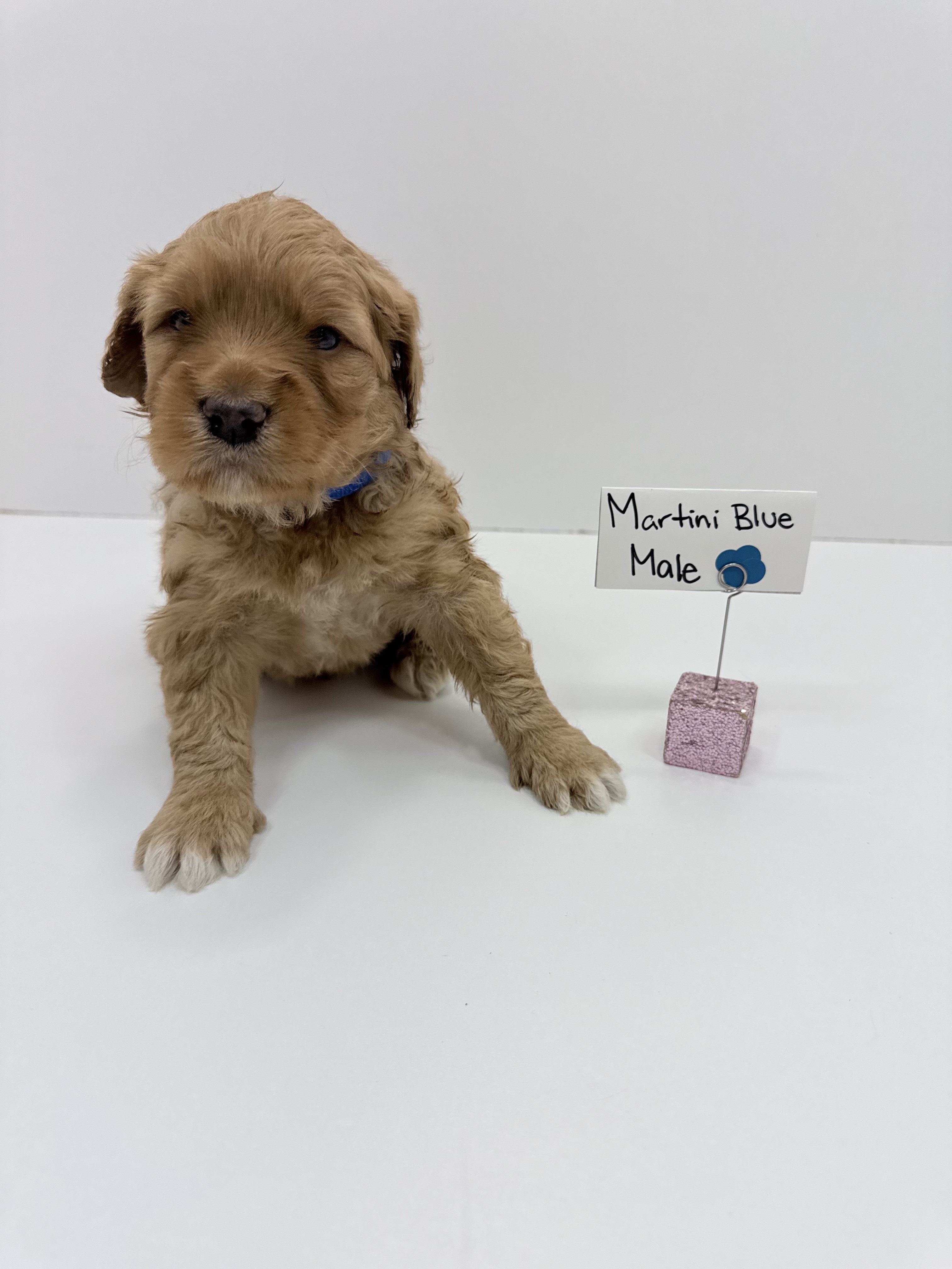 Martini is a white and gold parti pattern Moyen Poodle weighing 27 lbs and loves playing in the field and enjoying her favorite dried chicken treats.