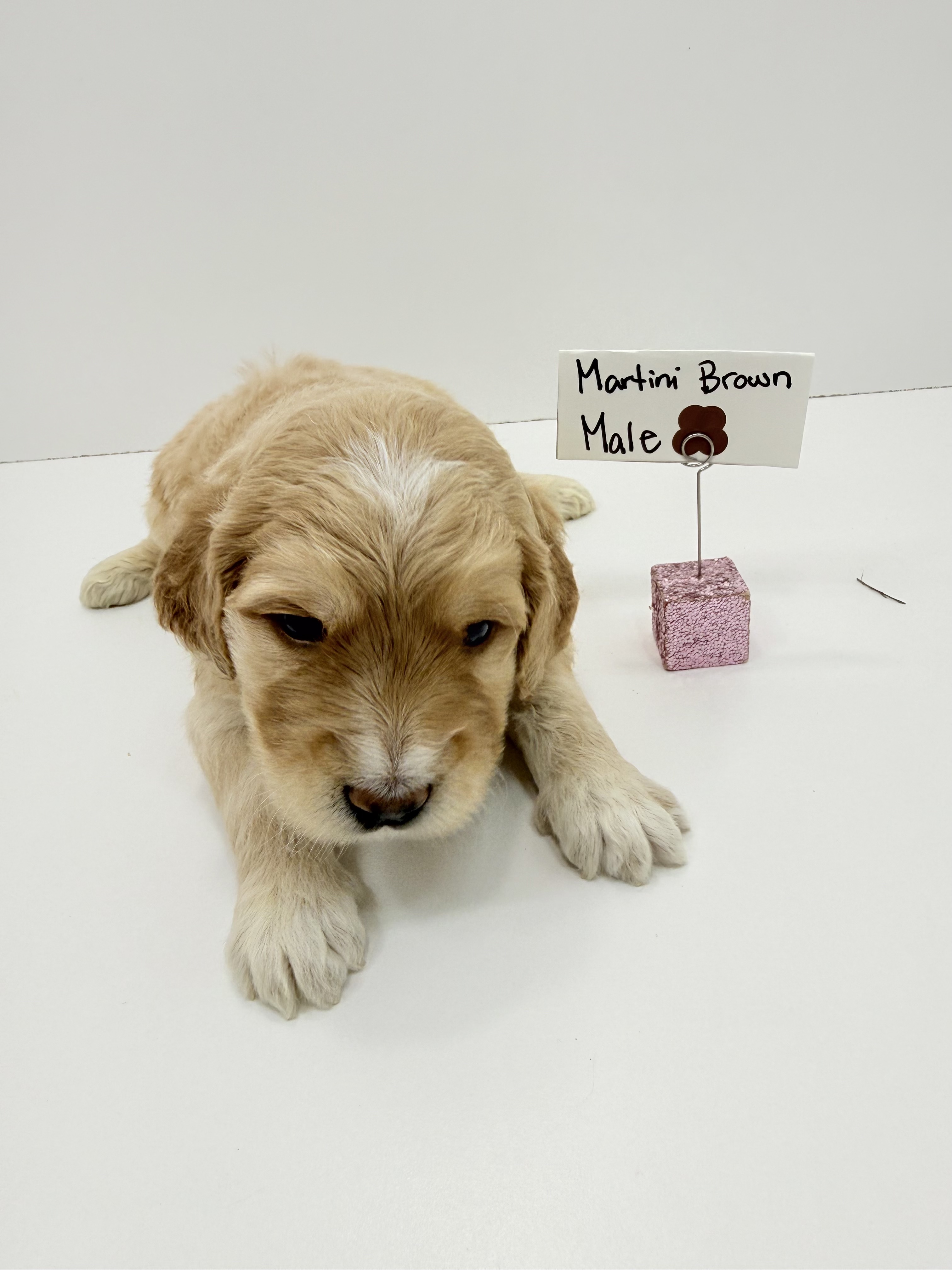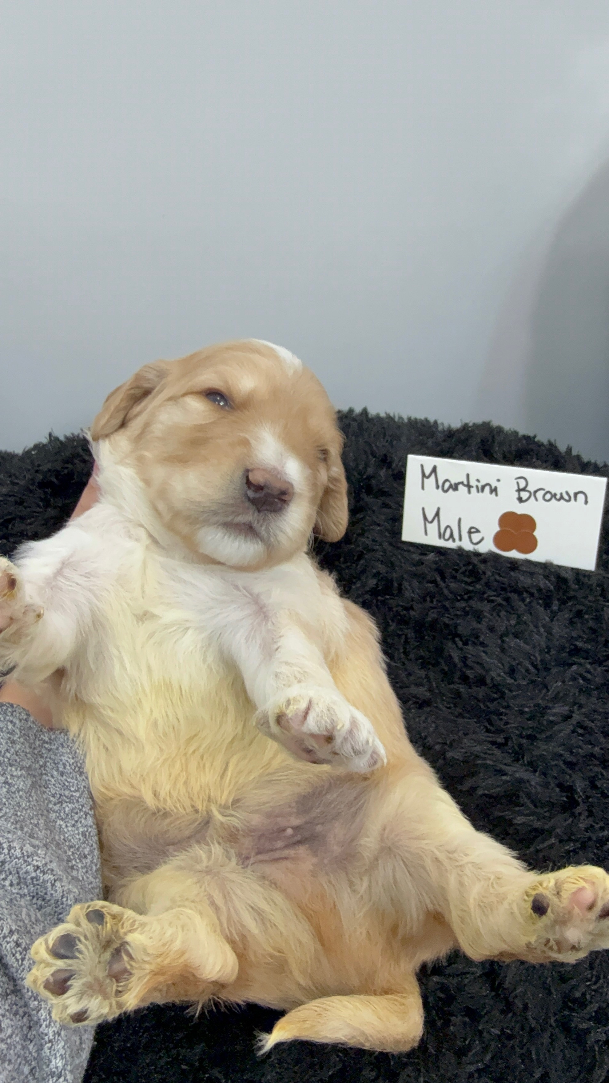 Martini is a white and gold parti pattern Moyen Poodle weighing 27 lbs and loves playing in the field and enjoying her favorite dried chicken treats.