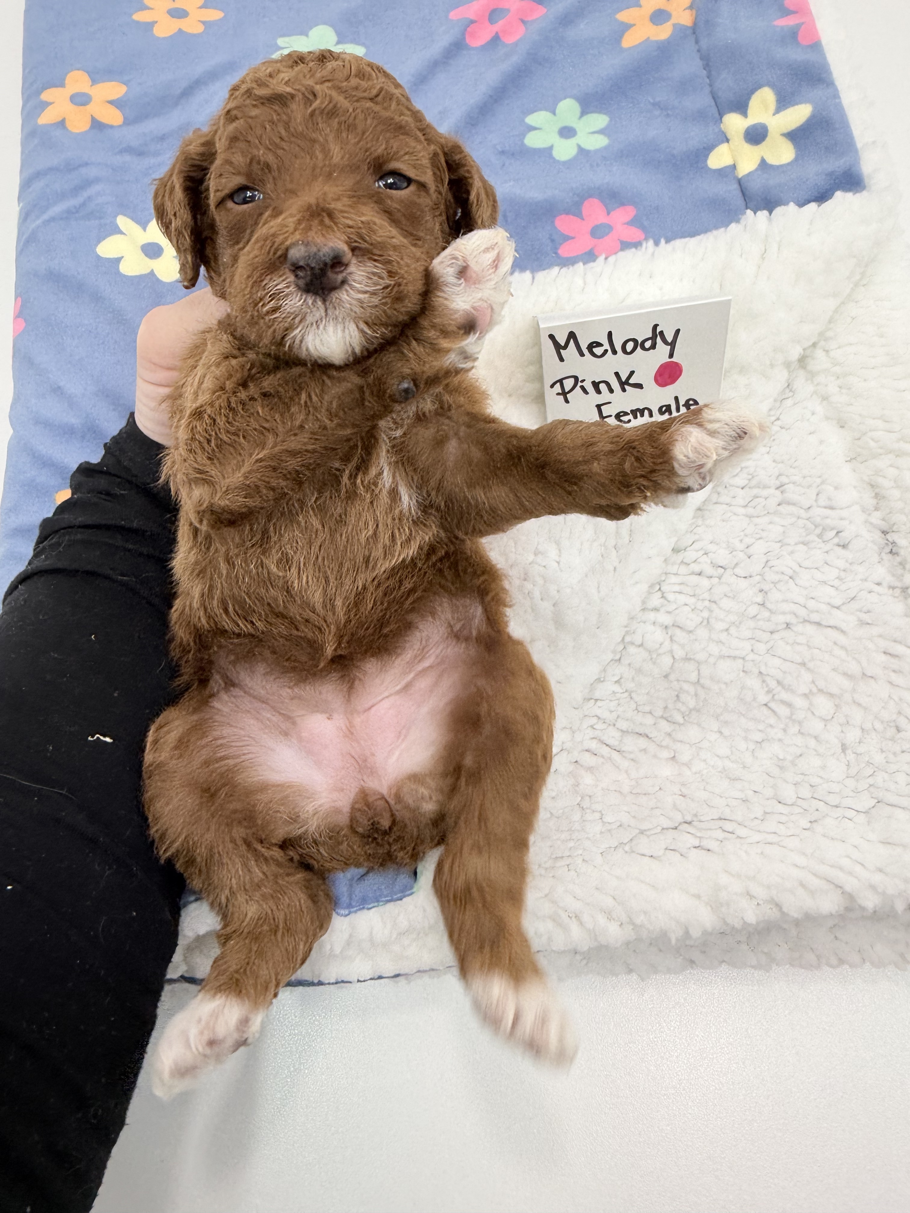 Melody is a 22-lb Red and White Poodle with the sweetest little personality. She loves treats, soft blankets, and following her favorite people around.
