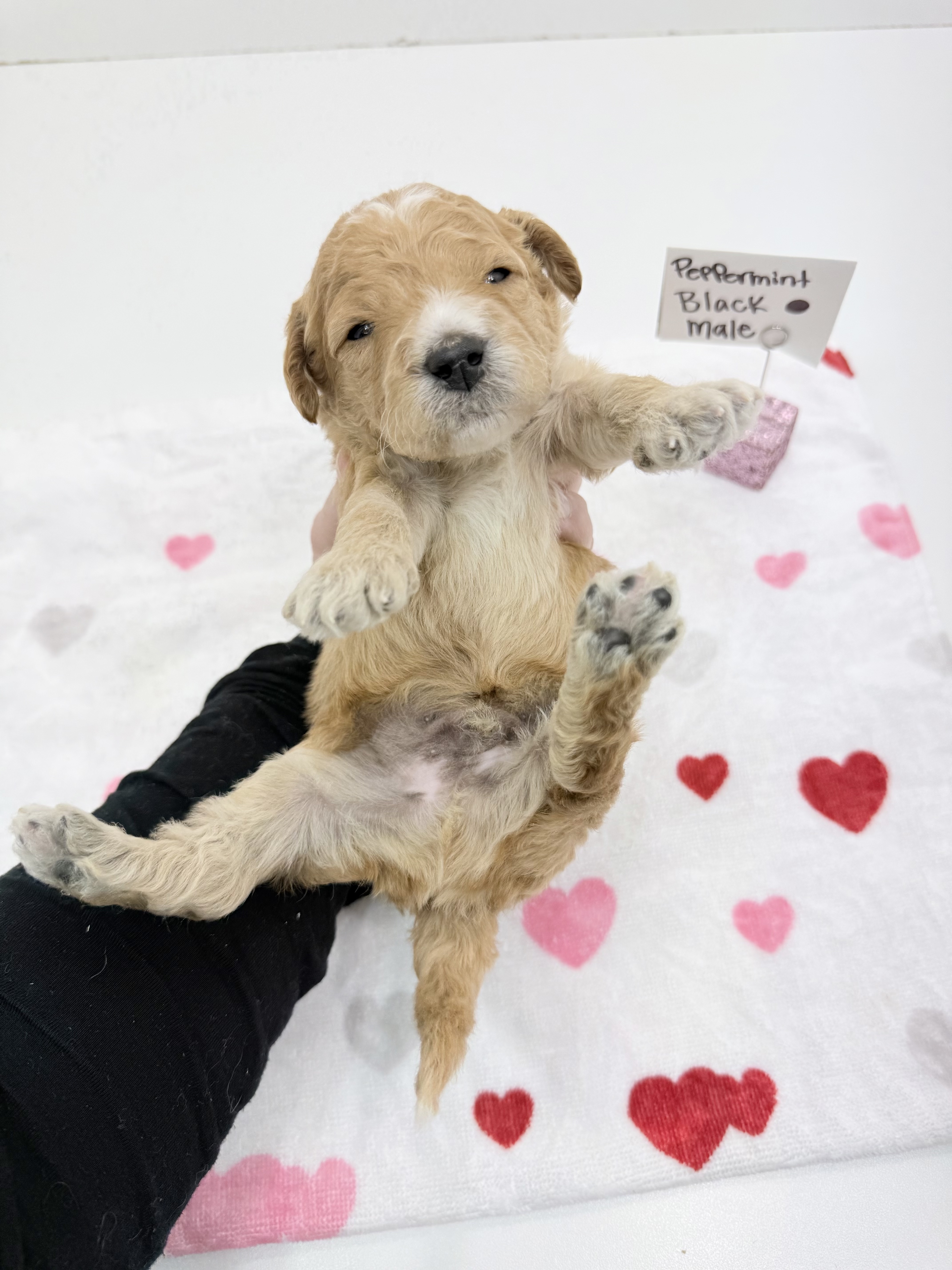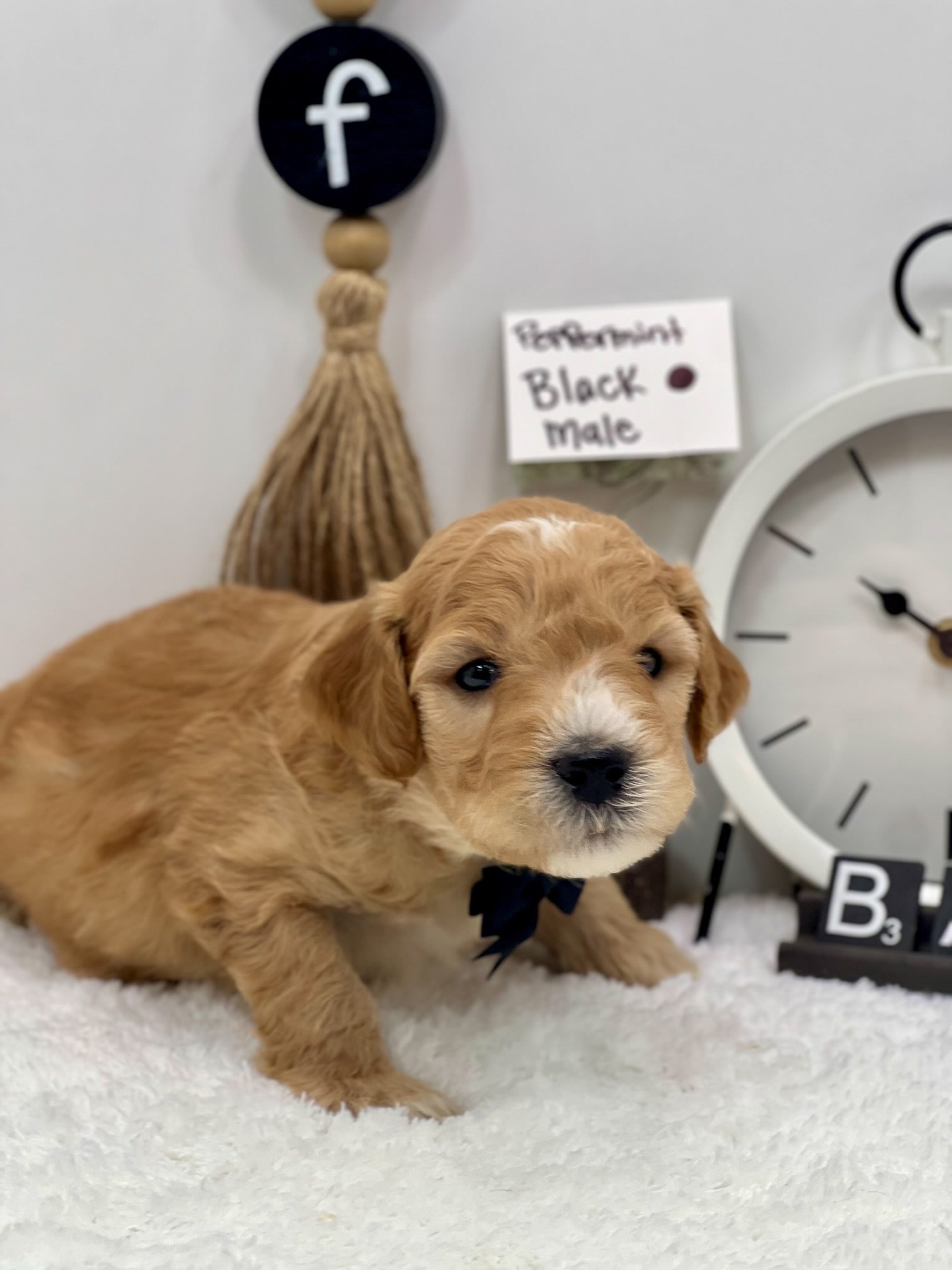 Peppermint is a Creamy gold F1 Moyen Golden doodle weighing 40lbs. She enjoys running in the field with her dog friends, and chasing the stick.