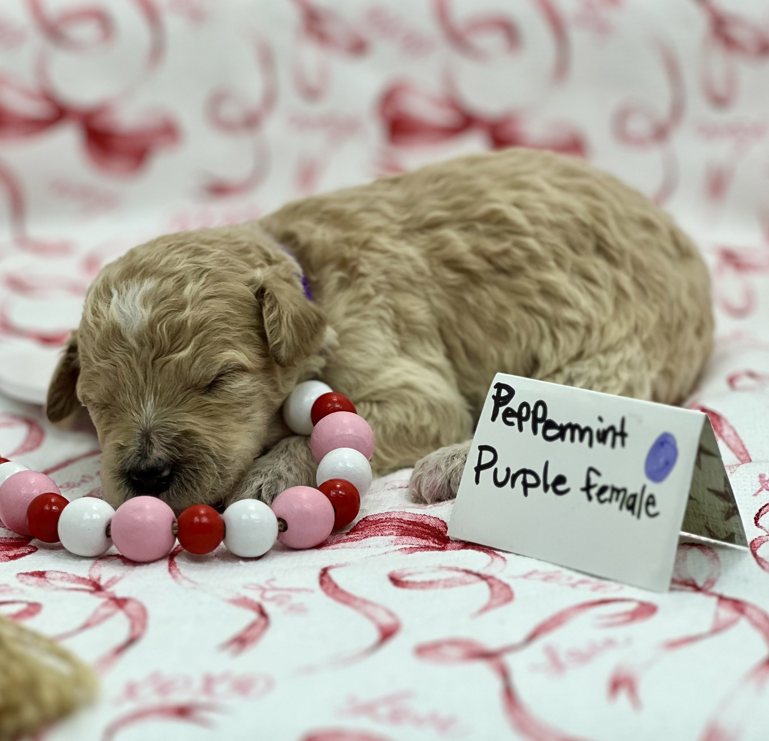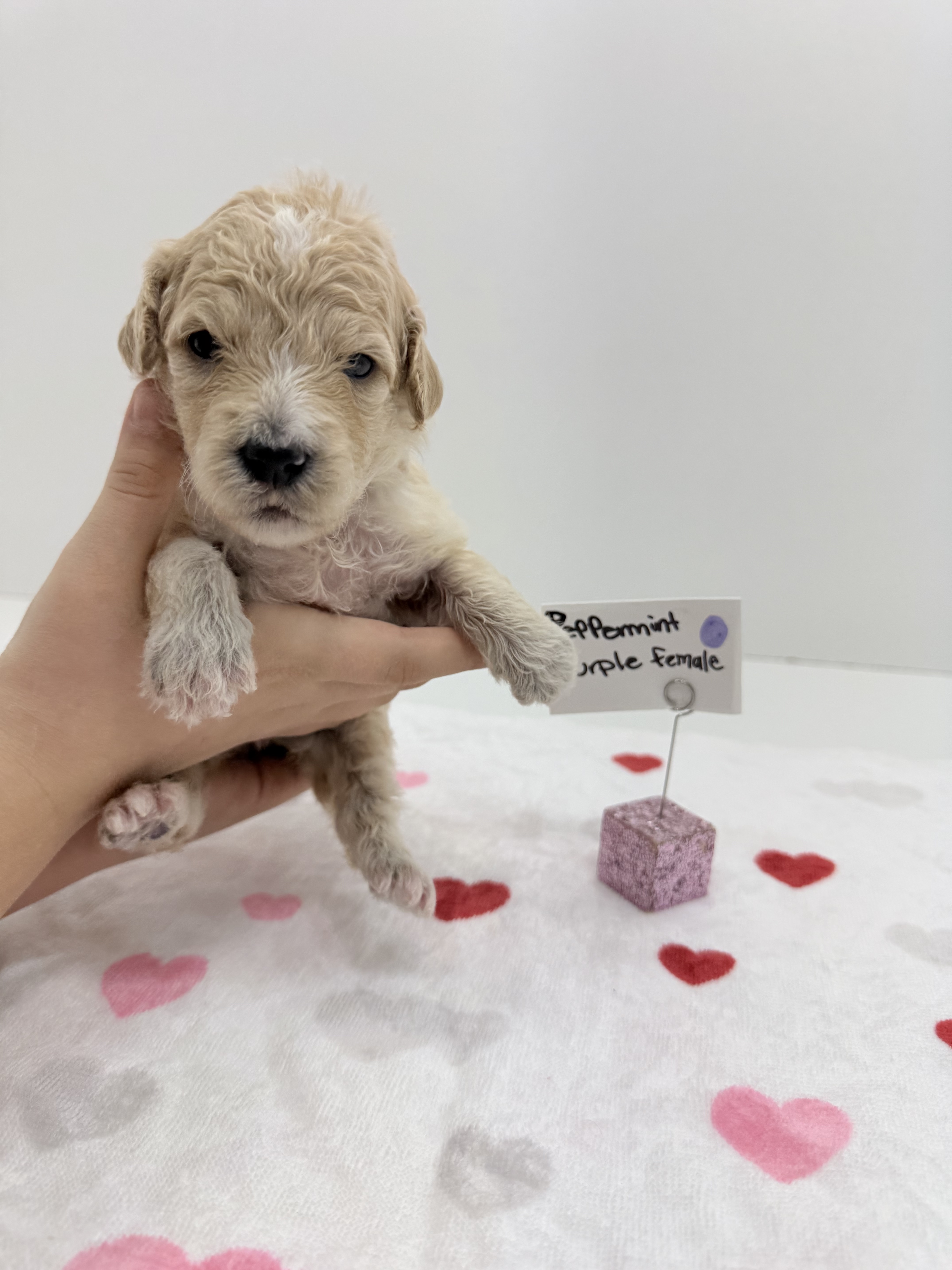Peppermint is a Creamy gold F1 Moyen Golden doodle weighing 40lbs. She enjoys running in the field with her dog friends, and chasing the stick.