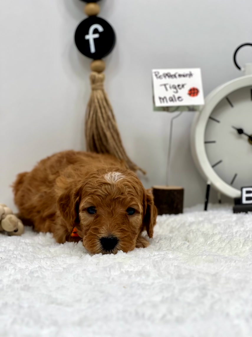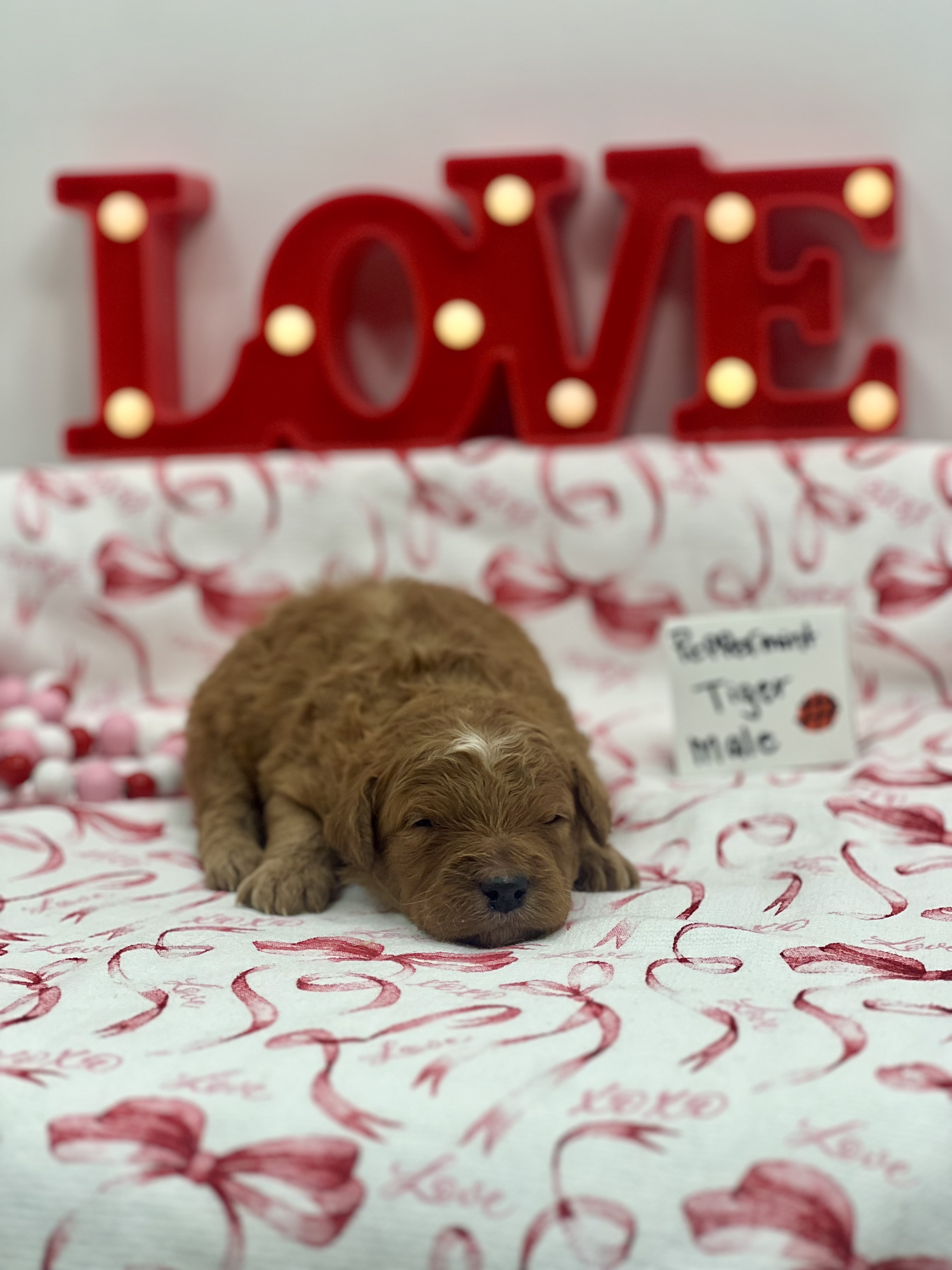 Peppermint is a Creamy gold F1 Moyen Golden doodle weighing 40lbs. She enjoys running in the field with her dog friends, and chasing the stick.