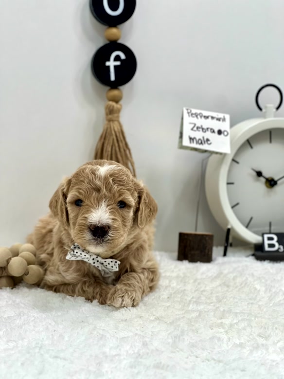 Peppermint is a Creamy gold F1 Moyen Golden doodle weighing 40lbs. She enjoys running in the field with her dog friends, and chasing the stick.